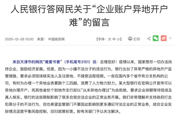 原标题:反洗钱导致企业开户难、异地开户难?被加入银行黑名单?央行回应了 1月19日,针对网友“初创企业银行开户被告知至少要等2个月?”的疑问,央行支付结算司在中国政府网答复称,央行上海总部立即向涉及银行调查了解情况,在此过程中,商业银行存在未合理安排企业开户工作、对企业开户时长管理意识淡薄等问题。 央行支付结算司同时介绍,当前电信网络诈骗、跨境赌博等违法犯罪活动高发频发,为保证存款人账户资金安全、防范账户风险,依据相关制度规定,商业银行在确保优质服务的同时加强客户身份识别,加大企业账户审核力度。 “后续,人民银行将针对此类问题举一反三,加大对商业银行账户服务情况的调查,多措并举持续加强指导商业银行优化账户服务流程,强化人员业务培训,在有效防控风险的前提下,有力提高企业银行账户开户效率。”央行支付结算司表示。 此外,针对网友提出的“常常遇到企业在网上申报时填错开户行名称导致资金无法发放的问题”,央行支付结算司表示,跨银行系统转账时账号和户名有重复的可能,为确保资金汇划安全,防止单纯凭收款人账号和户名划转可能出现的错误,需要通过收款人开户银行来区分。 央行支付结算司透露,随着支付业务功能的不断优化,目前青岛市各银行机构已实现收款人开户银行的智能分拣,如填写收款人开户银行难以具体到支行或分理处级别,可在保证银行类别正确的基础上,上填至管辖市级分行或省级分行,收款银行通过智能分拣自动处理。 21世纪经济报道记者注意到,去年12月以来,中国政府网“知民愿”栏目中有关网友反映企业开户难的留言大幅增加,仅2020年12月23日至2020年12月30日期间就有4条,而此前几个月类似留言几乎没有。 如,针对网民提出的“过度反洗钱措施影响企业正常开户和存款”“被加入银行黑名单”的问题,央行支付结算司答复称,央行不存在所谓的 “黑名单”,反洗钱工作对提高市场主体透明度、防止金融体系被违法犯罪活动利用、维护社会公平正义具有重要作用。 同时就网友反映的过度反洗钱会导致开户慢、存款手续复杂等问题,央行调查后表示,商业银行工作人员根据疫情防控要求采取轮班值守的工作安排,开户效率受到影响,在疫情有所缓解后,当地银行开户服务恢复正常办理效率。“让其配合提供业务合同等证明企业存在实际经营过程中,商业银行存在对有关核实原因解释不到位的情况,造成企业法定代表人误解。” 针对有网民提出的“对公账户开户费及账户管理费过高”的问题,央行支付结算司答复称,经调查,银行根据市场调节自行选择收取的一定费用中,与账户直接相关的费用不多,大部分属于客户自主选择的增值服务费用,客户可根据自身需求开通。 央行支付结算司同时表示,将继续督促商业银行在有效防范风险的前提下,强化内部管理,梳理并优化企业账户业务办理流程和要求,加强人员业务培训,不断提升账户服务水平。 而对网友提出的“企业账户异地开户难”“要求必须现场核实法人及注册地,不接受远程视频”的问题,央行支付结算司答复称,相关银行出于保护企业银行账户资金安全、防范账户被他人冒开、冒用风险的目的,结合客户风险程度、自身科技开发程度等因素,采取面对面或视频方式核实企业法定代表人真实开户意愿。“个别银行网点可能因业务办理不熟练,或者在与留言人解释过程中未充分说明可采取不同方式核实开户意愿等原因,造成留言人的误解。” 扫二维码 领开户福利!