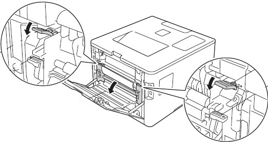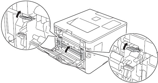 NOTE: If the envelope levers inside the back cover are pulled down to the envelope position. Lift these levers to the original position before pulling the blue tabs down. 3. Look into the machine to locate the two fuser rollers. Once you see the orange roller look above it to locate the black roller. The black roller should have smooth even black coating. Check in between the two fuser rollers and see if you see any damage to the rollers or if there is any paper stuck. If you find a paper stuck, very carefully remove it. When removing stuck paper from in between fuser rollers be careful as the area or the rollers might be extremely hot if the machine has just been recently used. - If the fuser rollers appear damaged, go to step 10. - If the fuser rollers are not damaged, continue to next step.