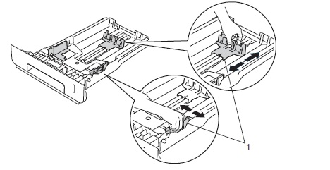 b. While pressing the blue paper-guide release lever in the back of the paper tray, slide the paper guide to fit the paper size. Adjust both the right and rear paper guides. Make sure that the guides are firmly in the slots. Make sure the paper guides touch the sides of the paper so it will feed properly.