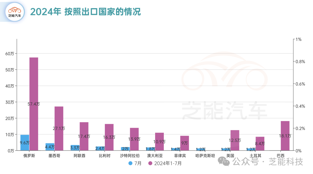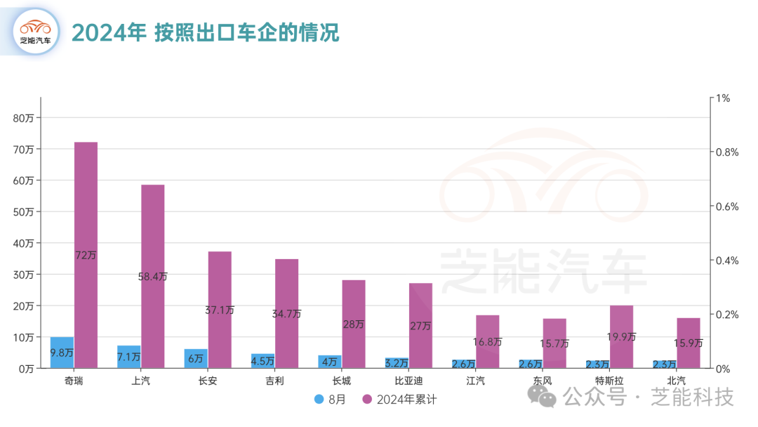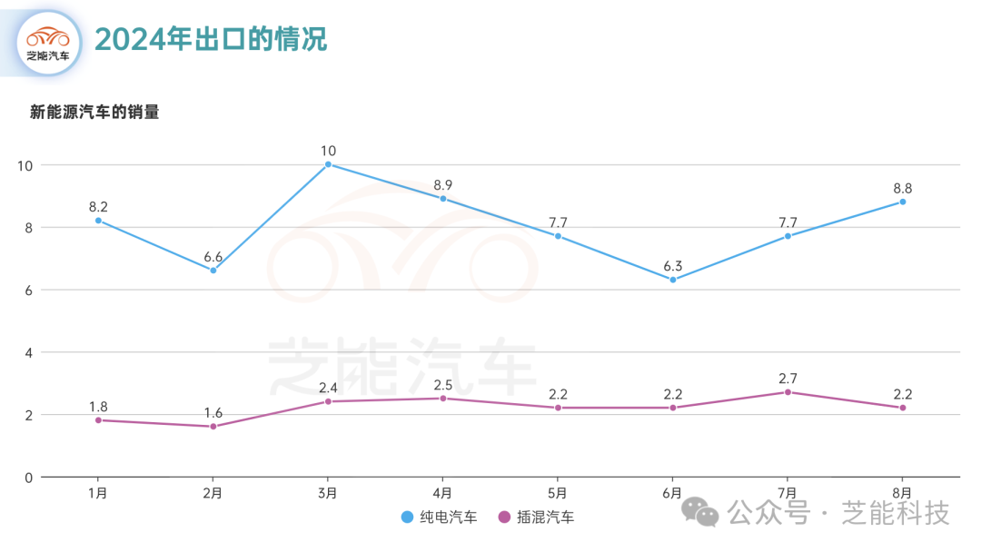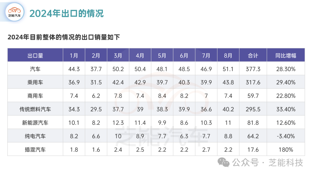 来源:芝能汽车 我们来盘点下2024年8月的中国汽车出口情况,欧博娱乐走到年中往下半段,中国汽车出口继续保持增长势头。 数据显示,8月我国出口的数据如下: ● 汽车出口达51.1万辆,环比增长9%,同比增长25.4%。 ● 乘用车出口43.8万辆,环比增长9.7%,同比增长25.6%。 ● 商用车出口7.4万辆,环比增长4.7%,同比增长24.7%。 ● 传统燃料汽车出口40.2万辆,环比增长9.8%,同比增长26.4%。 ● 新能源汽车出口11万辆,欧博allbet环比增长6.1%,同比增长22%。 01 出口数据概况 ● 传统燃料汽车出口295.5万辆,同比增长33.4%; ● 新能源汽车出口81.8万辆,同比增长12.6%。 客观来说,新能源汽车的出口天花板是比较明显的。 在新能源汽车细分市场中: ● 8月 ◎纯电动汽车出口8.8万辆,环比增长14.5%,同比增长5.9%; ◎插电式混合动力汽车出口2.2万辆,环比下降18.1%,但同比增长2.1倍。 从潜力来看,纯电动基本已经到顶了,特别是欧洲目前的税收政策。 ● 1-8月累计: ◎纯电动汽车出口64.2万辆,同比下降3.4%, ◎ 而插电式混合动力汽车出口17.6万辆,同比增长1.8倍。 02 整车企业 在整车企业的出口数据中 ● 8月 ◎奇瑞出口量达9.8万辆,同比增长12.7%,占总出口量的19.1%。 ◎吉利表现尤为突出,出口6万辆,同比增长1.1倍。 ● 1-8月 ◎比亚迪出口27万辆,同比增长1.2倍; ◎吉利出口34.7万辆,同比增长63%; ◎长安出口37.1万辆,同比增长60.7%。 中国汽车出口市场在2024年表现强劲,尤其是新能源汽车出口在部分市场增势明显。 根据中国汽车工业协会整理的海关总署数据,7月新能源汽车出口16.8万辆,环比增长26.1%,同比增长23.1%,其中,比利时、巴西和英国是主要市场。 特别声明:以上内容仅代表作者本人的观点或立场,不代表新浪财经头条的观点或立场。如因作品内容、版权或其他问题需要与新浪财经头条联系的,请于上述内容发布后的30天内进行。