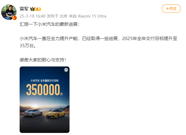 3月18日下午,欧博abg小米集团发布了2024年财报,雷军在微博称之为“史上最强年报”。 AI识股 据公司财报显示,小米集团第四季度,总收入达到1090亿元,同比增长48.8%;净利润为90亿元,同比增长90.4%。经调整净利润为83亿元,同比增长69.4%。 2024年全年,总收入达到3659亿元,创历史新高,同比增长35.0%;净利润为236亿元,同比增长34.9%。经调整净利润为272亿元,创历史新高,同比增长41.3%,其中包括智能电动汽车等创新业务经调整净亏损62亿元。 具体来看,小米智能手机业务全年实现收入1918亿元,欧博官网同比增长21.8%,毛利率达到12.6%。全球智能手机出货量为1.69亿台,同比增长15.7%。根据Canalys数据,2024年小米全球智能手机市场份额为13.8%,连续18个季度稳居全球前三。 IoT与生活消费产品业务首次突破千亿元规模,全年收入达1041亿元,同比增长30.0%,毛利率达到20.3%,同比提升3.9个百分点。其中,智能大家电业务延续高速增长态势,空调、冰箱与洗衣机出货量均创历史新高。空调产品出货量超680万台,同比增速超过50%;冰箱产品出货量超270万台,同比增速超过30%;洗衣机产品出货量超190万台,同比增速超过45%。 互联网服务收入和毛利率均创历史新高,收入达到人民币341亿元,同比增长13.3%,毛利率达到76.6%,同比提升2.5个百分点。2024年第四季度,互联网服务收入为人民币93亿元,同比增长18.5%,收入再创历史新高,毛利率达到76.5%,同比提升0.8个百分点。 智能电动汽车等创新业务总收入为328亿元,多项指标超预期达成。Xiaomi SU7不仅实现上市即交付、交付即上量,全年总交付量也超过10万台目标。 AI识股 年报称,2024年,Xiaomi SU7系列交付量达136854辆,同时将扩充产能,保障交付,全力冲刺2025年小米汽车交付35万台的目标。 雷军也在微博发文称:“汇报一下小米汽车的最新进展:小米汽车一直在全力提升产能,已经取得一些进展,2025年全年交付目标提升至35万台。感谢大家的耐心与支持!” AI识股 雷军还发微博表示,“刚刚,我们交付了第20万辆小米汽车”。交付车型为璀璨洋红色小米SU7。 雷军表示,“今天也是‘璀璨洋红’开始交付的日子”。同时,雷军还在评论区留言“首发不到一年”。 对于今日第20万辆汽车交付,小米汽车方面也表示:“交付持续提速,10万交付用了229天,20万交付仅用119天。” 截至3月18日港股收盘,小米集团股价报57.65港元/股,市值1.45万亿港元。 AI识股