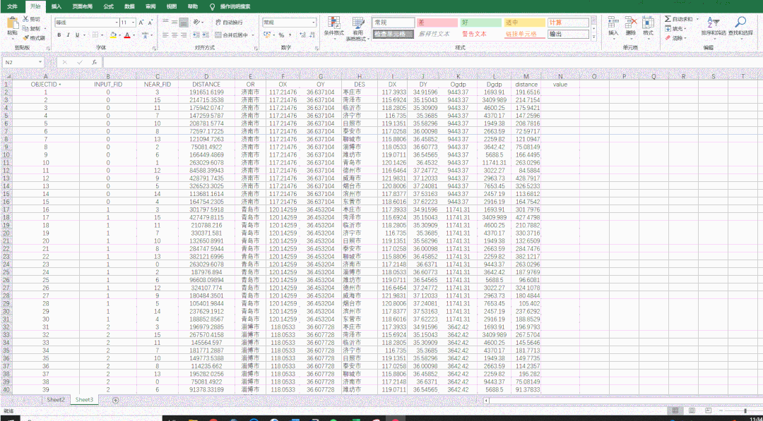 剩下的表头填充都是这方法,填充进去即可,不再演示。最后得到包含起点终点城市名,xy坐标,起终点GDP数据的表格。