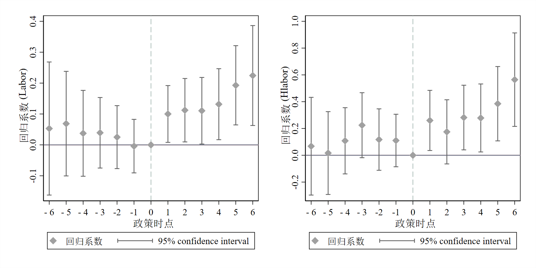 时间趋势图可以粗略地对政策实施前后处理组与对照组样本之间的变化趋势做出判断,是进行DID研究的前提所在。 graph set window fontface "Times New Roman"graph set window fontfacesans "宋体" // 设置图形输出的字体 egen mean_y=mean(entre_activation), by(year group) graph twoway (connect mean_y year if group==1,sort) (connect mean_y year if group==0,sort lpattern(dash)), /// xline(2010,lpattern(dash) lcolor(gray)) /// ytitle("{stSans:创}""{stSans:业}""{stSans:活}""{stSans:跃}""{stSans:度}",orientation(h)) xtitle("{stSans:年度}") /// ylabel(0(0.5)3,labsize(*0.75) format(%02.1f)) xlabel(,labsize(*0.75)) /// legend(label(1 "{stSans:处理组}") label( 2 "{stSans:控制组}")) ///图例 xlabel(2004 (1) 2018) graphregion(color(white)) //白底 graph export "平行趋势事前检验.png" 如图 1 所示,以 2010 年国家创新型城市试点为例,2010 年之后,试点城市(处理组)的创业活跃度相对于非试点城市(对照组)经历了更高程度的增长,二者的创业活跃度差距逐渐扩大,而在 2010 年之前,二者具有较为一致的变化趋势。 5.2 事件分析法事件分析法检验平行趋势最常见的一种方法,一般模型构造如下: $$\operatorname Y_{i ,t}=\beta_{0}+\sum_{-k}^{s} \beta_{m} D_{i, t}^{m}+\gamma X_{i ,t}+\mu_{i}+\lambda _t+\varepsilon_{i, t} $$ 时间虚拟变量 D_{i,t}^{m} 表示各城市确立为试点城市前 k 年、当年和后 s 年的观测值,非试点城市虚拟变量均为 0。白俊红等(2022)中,考虑到政策实施时间与试点数量等因素,取 k=3,s=8。本推文提供以下三种检验方法,详细经济学含义请参考原文。 (1)手动计算各时期虚拟变量,coefplot辅助作图(1)代码一 xtset city yeargen event = year - branch_reform if group==1 replace event = -4 if event <= -4 tab event, gen(eventt) forvalues i = 1/15{ replace eventt`i' = 0 if eventt`i' == . } drop eventt1 xtreg entre_activation eventt* $xlist i.year, r fe (2)代码二 gen distance=year-ptreplace distance = -4 if distance <= -4 tab distance,missing forvalues i=1/4{ gen d_`i' = 0 replace d_`i' = 1 if Treat== 1 & distance== -`i' } forvalues i=1/10 { gen d`i' = 0 replace d`i' = 1 if Treat== 1 & distance== `i' } gen d0 = 0 replace d0 = 1 if Treat== 1 & distance== 0 xtset city year xtreg entre_activation d_3 d_2 d_1 d0 d1-d10 $xlist i.year,fe r graph export "平行趋势检验.png",as(png) replace width(800) height(600) 上述两种方法对于时间虚拟变量的计算结果完全相同,不同之处在于代码一在运用coefplot绘图时需要将eventt*转换为基于政策前后的数值,代码二则可以直接绘图,平行趋势图如下: 据上图所知,政策发生前的相对时间虚拟变量系数均不显著且数值较小,表明政策发生之前,处理组与对照组在创业活跃度上无显著差异,满足平行趋势假设。进一步从动态效应来看,在政策发生后当年,试点政策短暂产生创业效应但还未稳定,试点政策推行 3 年后,创新型城市试点政策的影响系数显著为正并不断提升,表明创新型城市试点政策能够产生促进创业活跃度提升的政策效应,但具有一定的滞后性。 (2)tvdiff命令实现tvdiff能够实现仅运行一条命令就可以同时实现图示处理期前后处理效应,以及呈现平行趋势检验统计结果。可以参考推文Stata:多期倍分法 (DID) 详解及其图示,已对该方法做了详细讲解,也可以直接help tvdiff查询官网教程和数据获取。本推文重点在整理该方法,不再展开。 (3)eventdd命令的Stata操作(1)命令安装 ssc install eventdd, replace //安装命令(2)语法结构 eventdd命令是 Damian Clarke & Kathya Tapia Schythe (2021) 在现有事件分析法的基础上所编写的 Stata 新命令,其语法结构如下: eventdd depvar [indepvars] [ if ] [ in ] [ weight ] , ///timevar(timevar) ci(type, ...) [ method baseline(#) level(#) accum lags(#) leads(#) noend noline keepbal(varname) absorb(varname) wboot wboot_op(string) balanced inrange graph_op(string) ci_op(string) coef_op(string) endpoints_op(string)] depvar:被解释变量; indepvars:控制变量; timevar:必须,设定时间政策变量,与前文 year-policy 相同; ci (type, ...):指定置信区间的图形类型:rarea (带区域阴影)、rcap (带封顶尖钉)、rline (带线条),rcap 是默认的图表类型; method (type, [absorb (absvars)] * ...):指定估计方法,默认为ols,xtreg对应fe,hdfe对应absorb (absvars); baseline (#):指定政策时间相对基准期,默认为 - 1; level (#):设置置信度;默认值为 95%; lags (#):指明事件研究中要考虑的最大事件后时段,在accum、keepbal、inrange指定时,必须确定; `leads (#):指明事件研究中要考虑的最大事件前期数,同上; accum:指定超出某些指定值的所有时期都应累积到最终点数中; noend:当指定 accum 选项时,要求累积终点不显示在图形输出上; keepbal (varname):指定只保留面板中平衡的单位以供估计。这里varname 表示指示单位的面板变量(如 state); balanced:要求只绘制 “平衡的” 提前和滞后期; inrange:要求只绘制指定期数的提前和滞后期图形; noline:删除 - 1 这条基准线; wboot:要求用wild bootstrap估计置信区间; wboot_op (string):指定任意选项用于wild bootstrap估计,(例如seed ()、bootcluster ()); graph_op (string):允许包含twoway中允许的任何其他通用图形选项,包括标题、线型、轴标签等; coef_op (string):允许包含scatter中的图形选项; endpoints_op:允许包含端点系数的scatter图形选项,须在accum下使用; (3)实例教学 下面我们使用作者提供的数据来检验此命令。 webuse setwebuse bacon_example.dta, clear //导入数据 xtset stfips year xtreg asmrs post pcinc asmrh cases i.year, fe cluster(stfips) gen timeToTreat = year - _nfd //设定时间政策变量 作者使用了 Stevenson 和 Wolfers(2006)关于美国