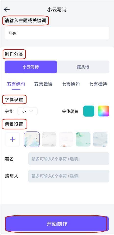 在小云写诗功能中,用户只需提供关键词或主题,并设置好分类、字体和背景等,点击生成键后,它就能自动生成完整的古诗作品。