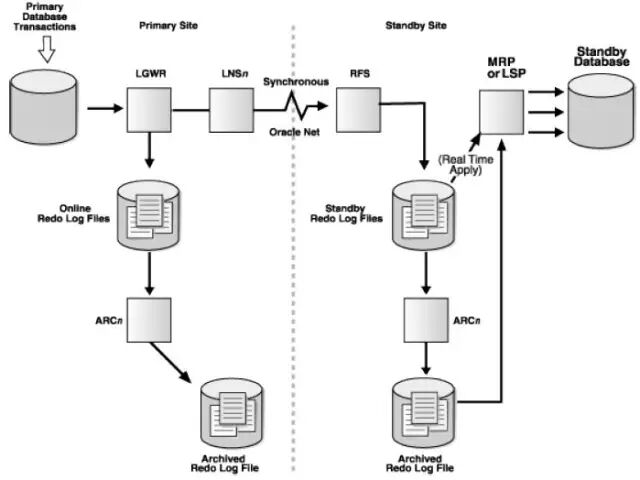 1. 日志传输方式 有两种日志传输方式(ARC和LGWR),第一种是采用ARC进程传输日志,其示意图如下: 注:上图来自《大话Oracle RAC》 其大致过程如下: 1)主库:日志先写入在线重做日志,当在线重做日志满后(或人为切换), ARC0进程归档该日志至主库本地归档目录,归档完成后,ARC1马上将该归档日志传输到备库; 2)备库:RFS进程接收日志,如果备库有Standby重做日志,则把日志复制到Standby重做日志,接着把Standby重做日志归档至备库本地归档目录,最后应用归档日志;如果没有配置Standby重做日志,RFS进程接收日志后,直接把它放到备库的归档目录下,再应用该日志。 另外一种是使用LGWR进程传输日志,它又分为两种方式,分别是ASYNC和SYNC,下面是ASYNC的示意图: 下面是SYNC的示意图如下: 注:上图来自《大话Oracle RAC》 用LGWR传输大致如下: 1)主库:只要有新的重做日志产生,LGWR进程将触发LNSn进程把新生成的日志传输到备库(注意:这里不能由LGWR直接传输,因为整个数据库实例只有一个LGWR,为了保证它的主要业务性能不受影响,不能由它直接传输); 2)备库:RFS进程接收到日志后,将其写入Standby重做日志,如果备库开启了实时应用,就立即做日志应用,如果没有开启,则等Standby重做日志归档后再应用。 3)其中,ASYNC和SYNC的区别在于:SYNC是在redo还在内存时,LNSn进程就开始传输,而ASYNC是在redo缓冲到online redo log后,LNSn才开始传输。 从上面可以得出,从同步的实时性来看,LGWR(SYNC) > LGWR(ASYNC)> ARCH 2. 日志发送的配置主库的日志发送是由log_archive_dest_n参数设置(注意:同时还有一个和它相对应的开关参数log_archive_dest_state_n,用于指定该参数是否有效),下面简单介绍下该参数各个属性的含义。 SERVICE(必须):指定备库的网络连接名; SYNC/ASYNC(默认为ASYNC):指定日志的传输模式(同步/异步); NET_TIMEOUT:指定当采用SYNC传输模式时,超过多少秒则表示网路超时(默认为30s),在使用SNYC模式时,强烈建议设置改参数; AFFIRM/NOAFFIRM:AFFIRM表示只有当日志写入Standby重做日志后才算日志传输成功,NOAFFIRM则没有这个要求; DB_UNIQUE_NAME:指定备库的DB_UNIQUE_NAME; VALID_FOR:格式为(redo_log_type,database_role),只有这两个条件全部符合,才会发送日志; 其中redo_log_type有如下取值:ONLINE_LOGFILE, STANDBY_LOGFILE, ALL_LOGFILES database_role有如下取值:PRIMARY_ROLE, STANDBY_ROLE, ALL_ROLES REOPEN:指定当连接错误发生时,多少秒之后重试; COMPRESSION:指定是否对日志进行压缩,已提高网络传输性能。 下面是log_archive_dest_n的一个例子: DB_UNIQUE_NAME=BOSTON LOG_ARCHIVE_CONFIG='DG_CONFIG=(BOSTON,CHICAGO,HARTFORD)' LOG_ARCHIVE_DEST_2='SERVICE=CHICAGO ASYNC NOAFFIRM VALID_FOR=(ONLINE_LOGFILE, PRIMARY_ROLE) REOPEN=60 COMPRESSION=ENABLE DB_UNIQUE_NAME=CHICAGO' LOG_ARCHIVE_DEST_STATE_2='ENABLE' LOG_ARCHIVE_DEST_3='SERVICE=HARTFORD SYNC AFFIRM NET_TIMEOUT=30 VALID_FOR=(ONLINE_LOGFILE,PRIMARY_ROLE) REOPEN=60 COMPRESSION=ENABLE DB_UNIQUE_NAME=HARTFORD' LOG_ARCHIVE_DEST_STATE_3='ENABLE' 3. 日志接受的配置在备库,当RFS进程接受到日志后,就将其写入Standby日志文件里,备库的Standby日志文件可以看做是主库在线日志文件的一个镜像,当主库做日志切换时,备库的Standby日志也做相应的切换,切换后的Standby日志由备库的ARCH进程归档。Oracle规定备库的Standby日志文件大小不能小于主库在线日志文件最大的一个,一般情况下,为了管理方便,最好把所有的在线日志和Standby日志大小设为一样。Oracle还规定备库的Standby日志文件至少要比主库的在线日志文件多一组。通过下面语句可以查询主库在线日志的大小和组数: SQL> SELECT GROUP#, BYTES FROM V$LOG; 通过下面的语句可以查询备库Standby日志的大小和组数: SQL> SELECT GROUP#, BYTES FROM V$STANDBY_LOG; 假设主库有两组在线日志,每个日志文件大小为500M,那么我们至少需要3组Standy,且每个日志文件大小不少于500M: SQL> ALTER DATABASE ADD STANDBY LOGFILE ('/oracle/dbs/slog1.rdo') SIZE 500M; 上面提到过,备库的Standby日志也会被归档,它的归档路径由备库的log_archive_dest_n参数的location属性设置,如下所示: LOG_ARCHIVE_DEST_1 = 'LOCATION = disk2/archive VALID_FOR=(STANDBY_LOGFILE,STANDBY_ROLE)' LOG_ARCHIVE_DEST_STATE_2=ENABLE 4. 日志传输状态的监控 第一步:在主库执行如下语句获得最新归档序列号: SQL> SELECT MAX(SEQUENCE#), THREAD# FROM V$ARCHIVED_LOG GROUP BY THREAD#; 第二步:在主库执行如下语句确认最新归档的日志是否已经传输至备库: SQL> SELECT DESTINATION, STATUS, ARCHIVED_THREAD#, ARCHIVED_SEQ# FROM V$ARCHIVE_DEST_STATUS WHERE STATUS <>'DEFERRED' AND STATUS <>'INACTIVE';