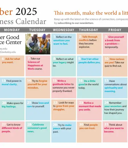 Keep Up with the GGSC Happiness Calendar Make the world a little better this month Add to that some pretty weird anomalies—like the neurotransmitter serotonin, which modulates mood, being produced primarily by our gut bacteria—and it becomes clear that we don’t understand everything about our brains and happiness. Much of it may be out of our conscious control. “Just embrace the important point: The things that influence our brain’s ability to make us happy extend far beyond just our experiences and personal preferences,” warns Burnett. Inside the happy brainInstead of a grand summary, Burnett seems bent on meandering through neuroscience, following unexpected tangents, pointing out incongruent findings, and taking us through some unusual territory. For example, I hadn’t thought much about the influence of “home” on our brains. Why do we feel good when we enter our house at the end of the day or feel nostalgic for it when we leave? This has to do with the connection between home and safety, and the fact that our brains have evolved to help us recognize and enjoy things that are biologically relevant to us through the release of feel-good hormones. It also explains why we get homesickness—it can be dangerous to be far from home, so our brains let us know that—and why we don’t always have a sound sleep the first night away from home—to keep us vigilant in our strange, potentially unsafe surroundings. But how do we know “home” from “not home”? Burnett writes about “boundary cells” in our brains and how they activate when we get to environmental boundaries—like a river at the edge of our property, or a door to the outside of our house—and help us recognize our safety zones. Though we need to go beyond these boundaries to explore—and curiosity is a relevant biological drive, too—we will feel less anxious exploring if we have a safety zone to retreat to (aka home). Burnett goes on to explain how work, laughter, love, lust, and our age all impact happiness, too, and how that’s mapped in the brain. For example, humor happens when we find something unexpected and incongruent—like an elephant shopping in a supermarket—and can resolve what’s going on by “getting” the joke or solving the puzzle. Perhaps because the ability to come up with novel solutions is a survival skill, our brains reward this activity with the pleasant feeling of being amused. And we have parts of our brains devoted to understanding jokes—namely, the temporal, occipital, and parietal lobes, from which laugher apparently originates. The book is full of fun tidbits like this, too numerous to name them all. But they help explain things like why we might fall in love with someone who isn’t necessarily good for us and be blind to their flaws, and why something that makes us happy in our adolescence doesn’t move us nearly as much in adulthood.