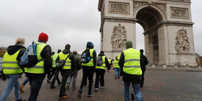 Protestors dressed in yellow vests (gilets jaunes in french) walks towards the Arc de Triomphe, in Paris on November 24, 2018 during a national gather...