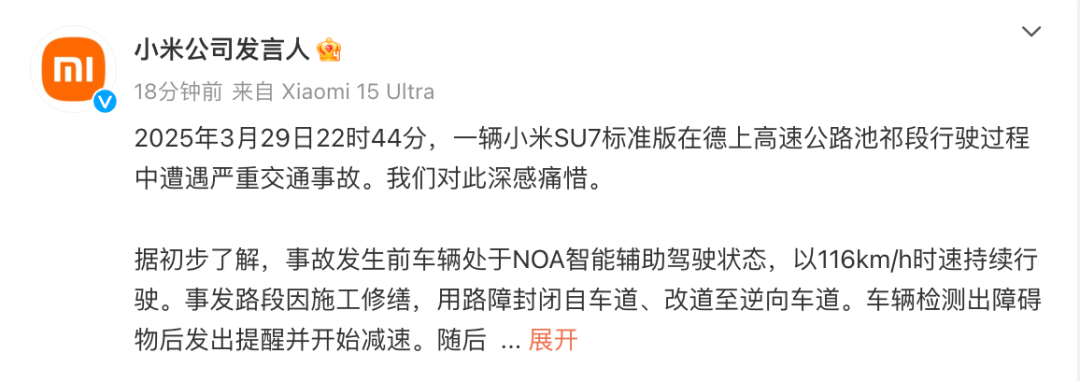 小米公布小米SU7高速碰撞爆燃事件细节。 4月1日午间,针对网传小米SU7碰撞爆燃事件,小米公司发言人正式发文,公布事件细节。 全文如下—— 2025年3月29日22时44分,一辆小米SU7标准版在德上高速公路池祁段行驶过程中遭遇严重交通事故。我们对此深感痛惜。 据初步了解,事故发生前车辆处于NOA智能辅助驾驶状态,以116km/h时速持续行驶。事发路段因施工修缮,用路障封闭自车道、改道至逆向车道。车辆检测出障碍物后发出提醒并开始减速。随后驾驶员接管车辆进入人驾状态,持续减速并操控车辆转向,随后车辆与隔离带水泥桩发生碰撞,碰撞前系统最后可以确认的时速约为97km/h。 碰撞发生后,我们立即与车主取得联系,了解非车主本人驾驶。同时,紧急救援呼叫车上乘员,并报警、呼叫120急救服务。 此后,警方随即抵达现场,全面介入调查事故。同时,我们第一时间成立了专项小组,于30日赶赴铜陵,在警方的指导下,积极配合调查、取证等各项工作,并于31日晚依法向警方提交完成我们所掌握的车辆行驶数据及系统运行信息。我们将继续全力配合警方工作,并严格遵循调查结果,确保事件处理公开透明。 同时,我们的专项组也将在警方的许可与指导下,与事故受难者家属取得联系,全力协助善后事宜,并提供支持与帮助。 我们将目前所知并提交给警方的信息,摘要公布如下: 3月29日 22:27:17 NOA激活,车速116km/h 3月29日 22:28:17 轻度分心报警 3月29日 22:36:48 NOA发出脱手预警提示“请手握方向盘” 3月29日 22:44:24 NOA发出风险提示“请注意前方有障碍”,发出减速请求,并开始减速 3月29日 22:44:25 NOA被接管,进入人驾状态,方向盘往左转角22.0625度,制动踏板开度31% 3月29日 22:44:26 方向盘往右转角1.0625度,制动踏板开度38% 3月29日 22:44:26-28之间 车辆与水泥护栏发生碰撞 3月29日 22:44:28 车端Ecall触发 3月29日 22:44:39 车端Ecall接通,确认事故发生,并报警、呼叫120急救服务 3月29日 22:45:06 与车主取得联系,确认非车主驾驶 3月29日 22:47:15 调配120成功 3月29日 约23时许 120抵达现场 相关话题冲上热搜 据多家媒体报道,该起事故造成3人身亡。铜陵高速公路管理中心回应称,事故原因正在调查中。 4月1日上午,小米汽车客服人员曾回应称,公司已经成立专门工作小组赶赴现场,会全力配合警方和家属对事故进行详细的还原调查,协助家属处理后续情况,将根据后续实际调查情况在官方渠道公布。消息传出后,“小米回应SU7高速上碰撞爆燃”话题一度冲上热搜榜第二。 而在小米公司公布事件细节后,相关话题再次引发热议,并冲上热搜榜第一。 最新数据显示,小米SU7汽车3月交付量再次超过29000台,已连续6个月交付量超2万台。小米汽车称,目前产能提升进展顺利,有信心达成全年35万台的交付目标。 股价方面,小米集团-W午后持续跳水,日内跌幅一度扩大至5%,成交额超120亿港元。截至发稿,每股报46.65港元,跌幅超过5%。 |